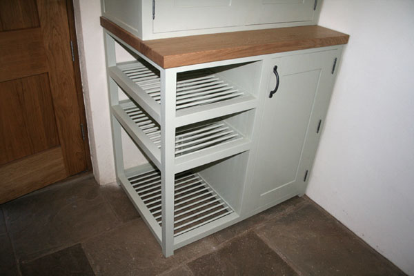 Porch Cabinet (painted pine with oak hardwood top) Dowel shoe racks pictured
